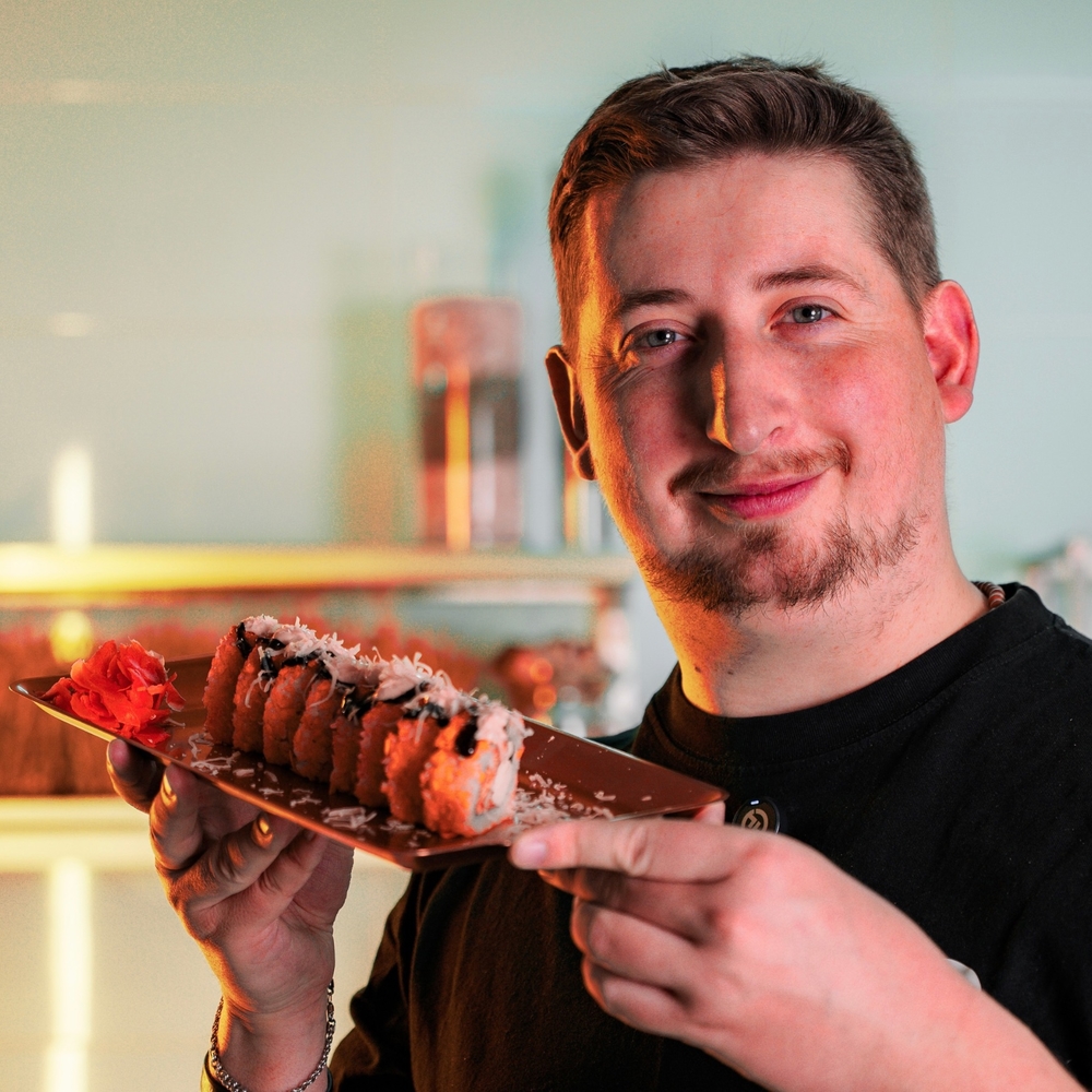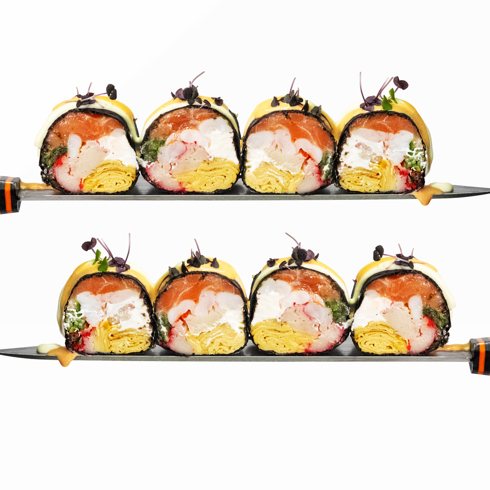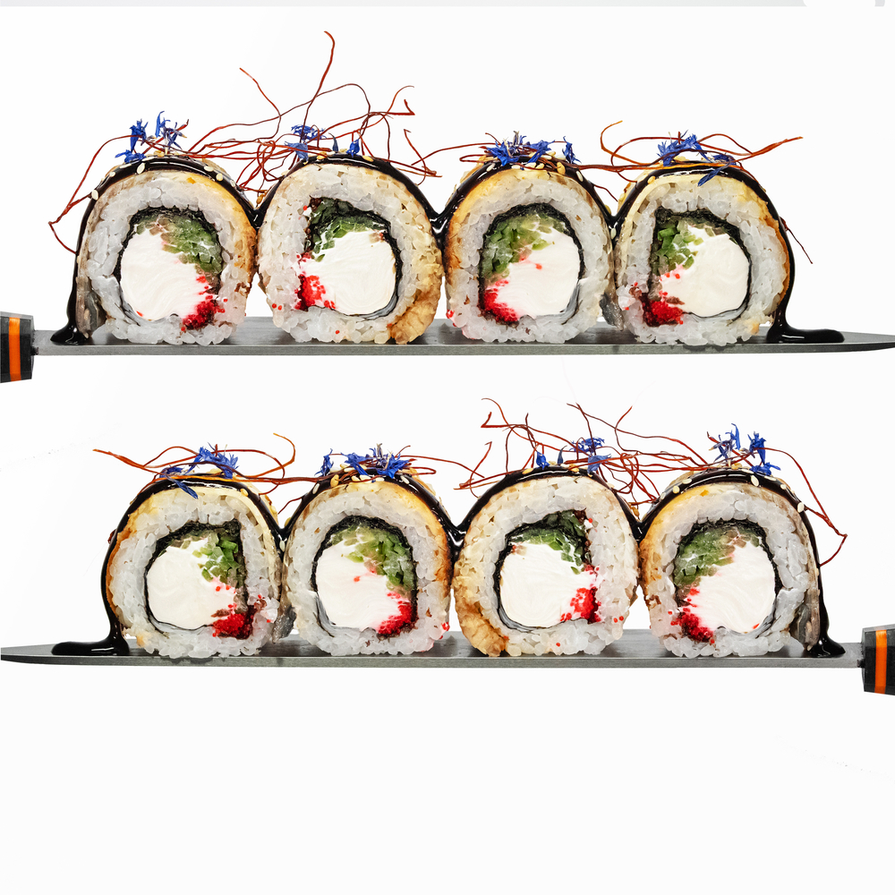 лосось,креветка, краб, крем-сир, огірок, омлет, ікра масаго, соуси чиллі майо, васабі айолі, сухарі панко |