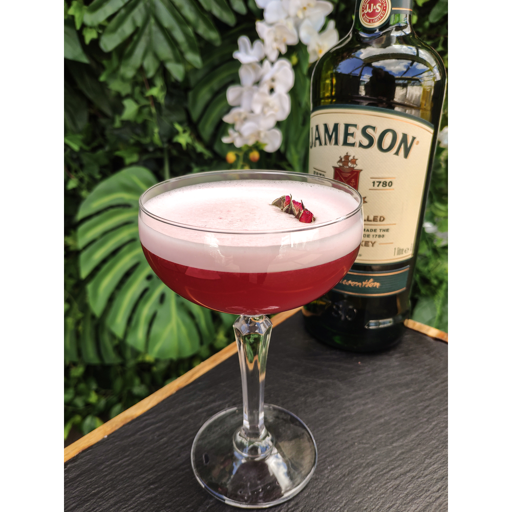 Сік: вишня та гранат з медом та спеціями(гвоздика та кориця), для гарного візуального ефекту (пінки) додаємо піноутворювач, та гарніруємо апельсином.