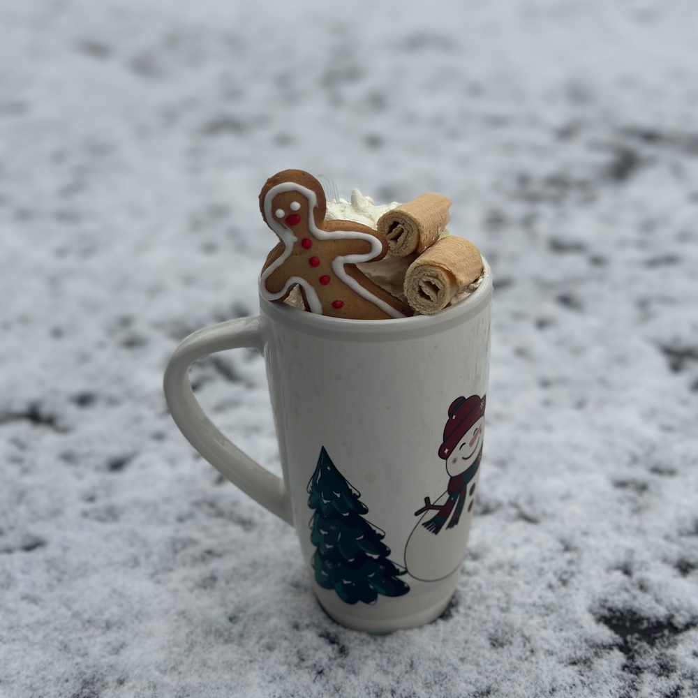 Какао, горіховий сироп, молоко, медовий пряник, аерозольні вершки, вафельні трубочки